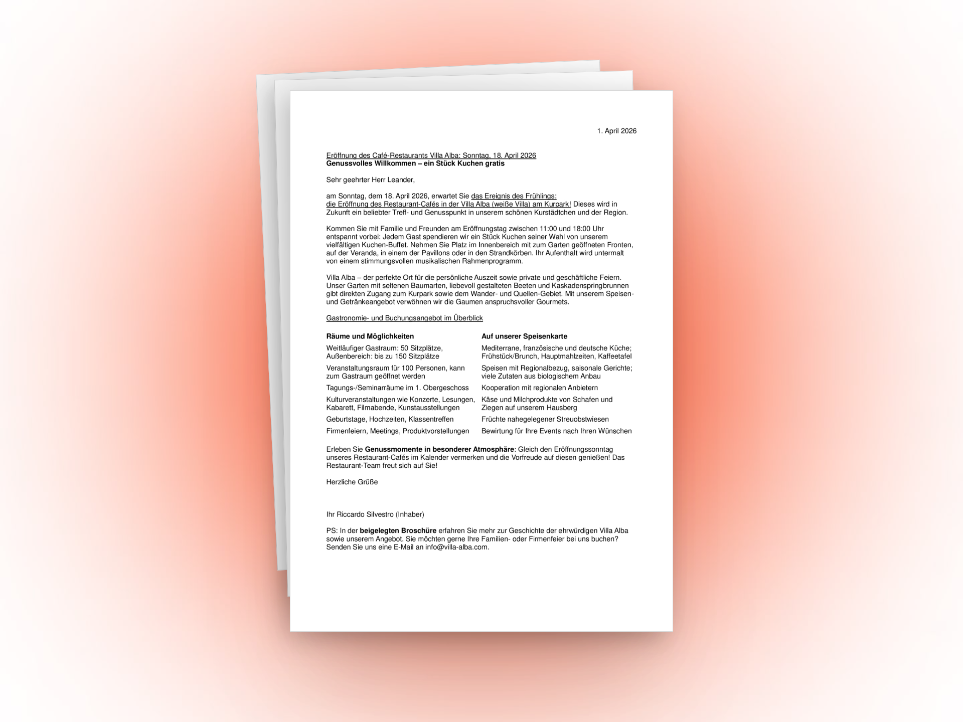 Ob Werbebrief zur Kundengewinnung, Firmeneröffnung oder anderen Anlässen. Ob geschäftliches Anschreiben oder Bewerbung. Im Texter-Angebot: Werbebriefe, Bewerbungen und andere Anschreiben als E-Mailing oder Brief.